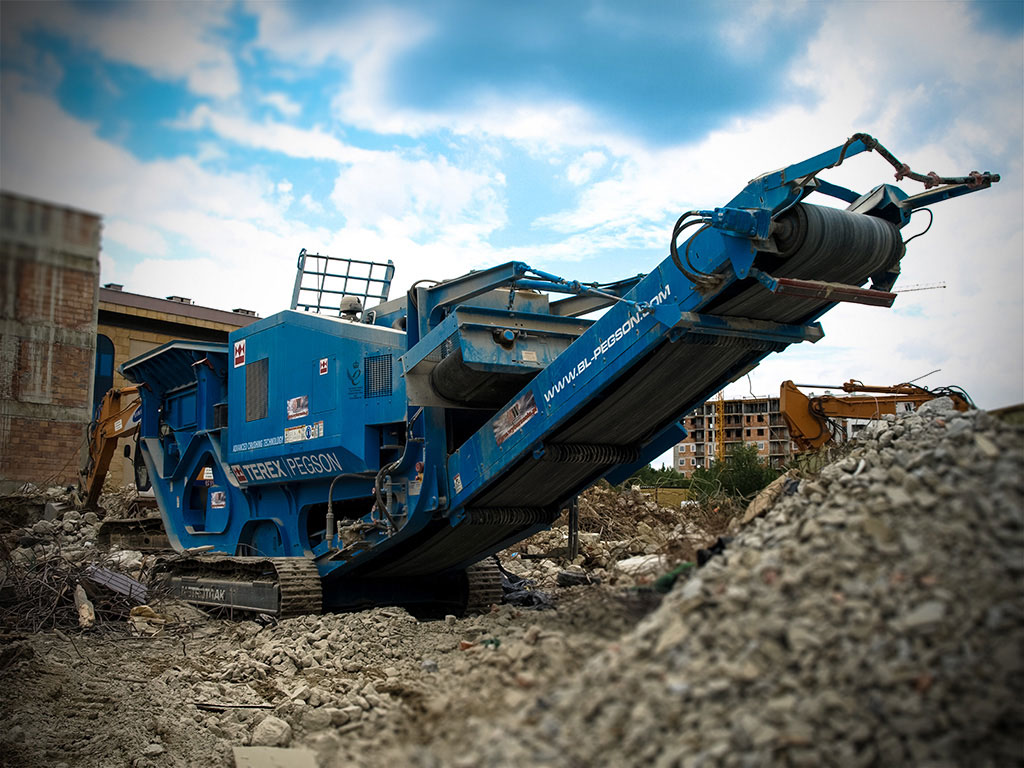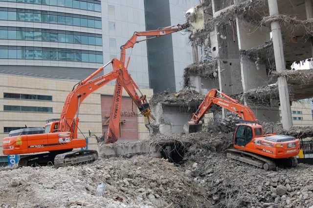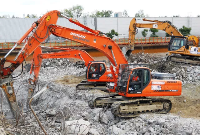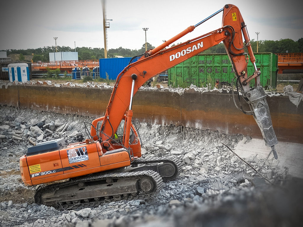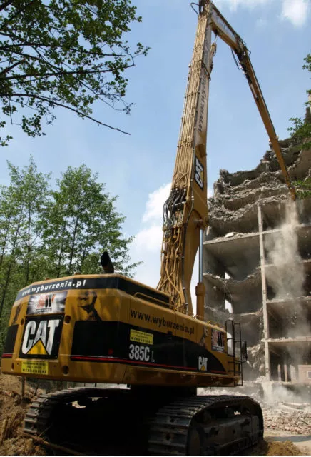Profesjonalne maszyny, koparki o zasięgu roboczym do 40 metrów, wyposażone w pełen osprzęt specjalistyczny: nożyce do kruszenia żelbetu i cięcia stali, młoty hydrauliczne czy pulweryzatory.